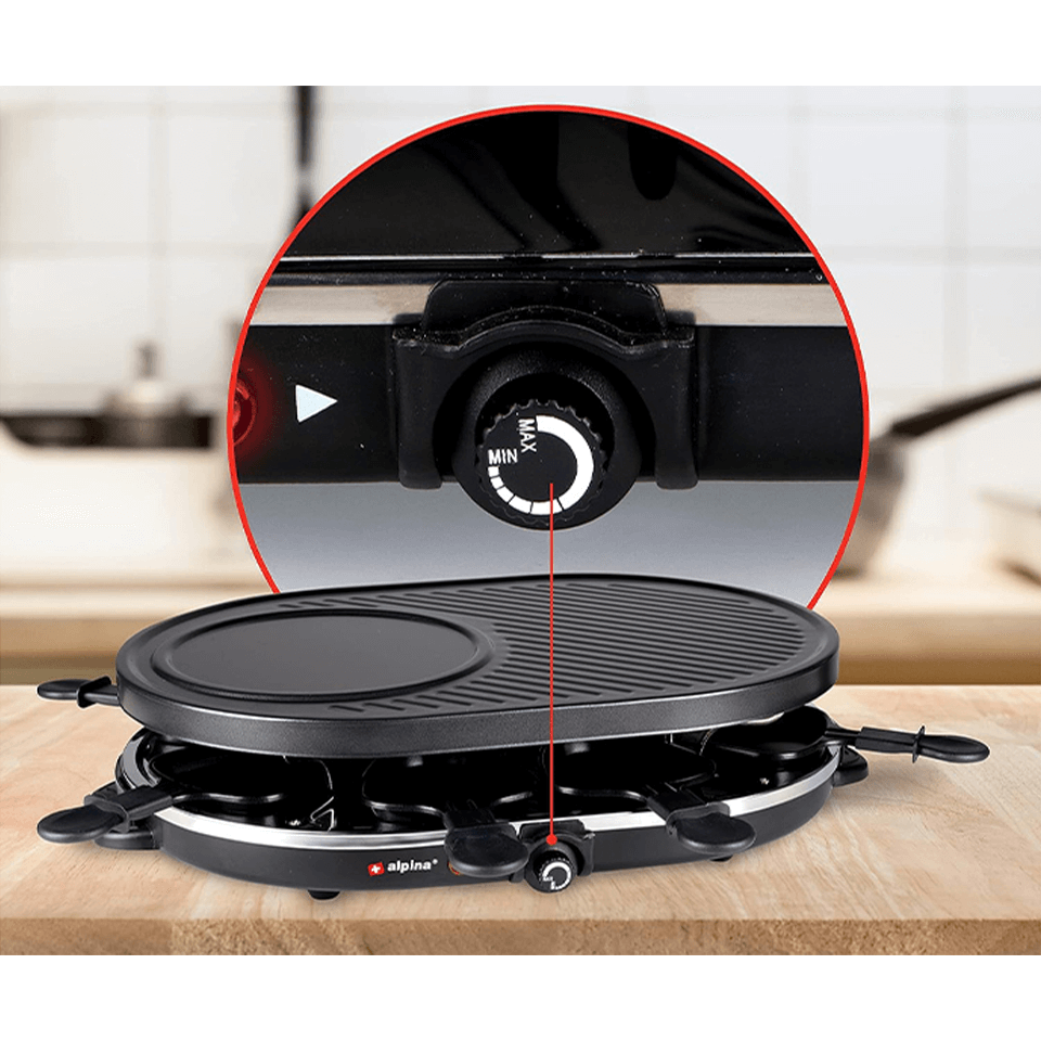 La moitié du barbecue électrique est une plaque de pierre, l’autre une plaque de cuisson et 8 poêlons gastronomiques en bas.