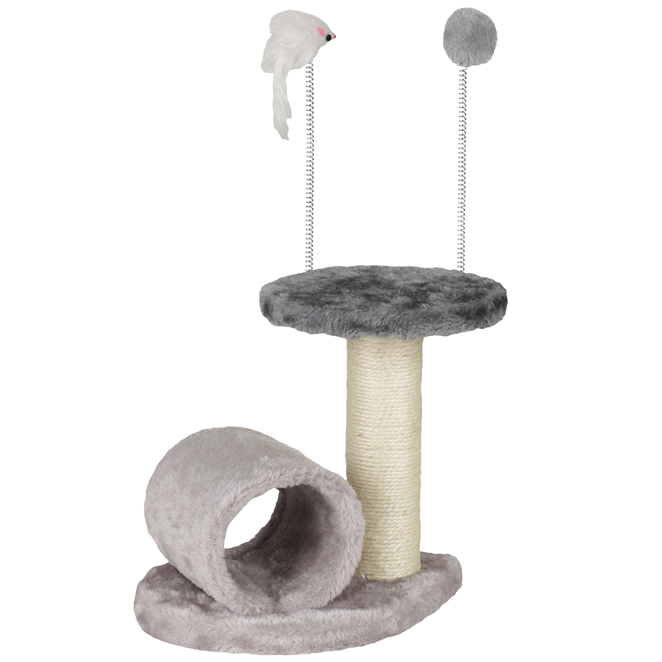 Des plateformes douces et stables permettent de se reposer ou d’observer son environnement, tandis que le jouet suspendu invite à l’amusement et à la chasse.