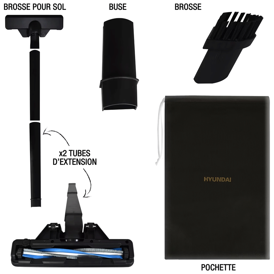 Accessoires pour une utilisation polyvalente : la buse allongée est parfaite pour les coins ou les recoins entre les coussins de canapé, la brosse facilite le nettoyage des meubles rembourrés.