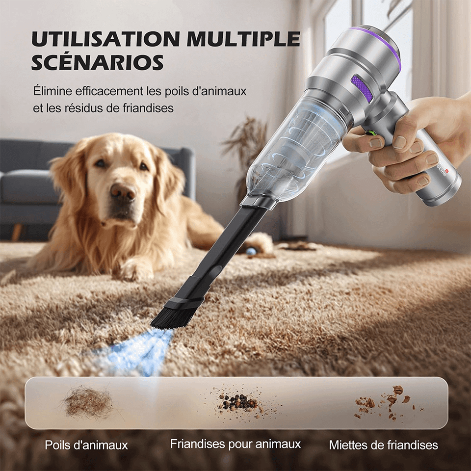 Ne vous fiez pas à sa taille ! Ce petit bijou de technologie combine aspiration ultra puissante (jusqu’à 16Kpa) et soufflage haute vitesse dans un format ultra compact. Idéal pour la maison, la voiture, les claviers, les recoins… partout où un aspirateur classique ne passe pas.