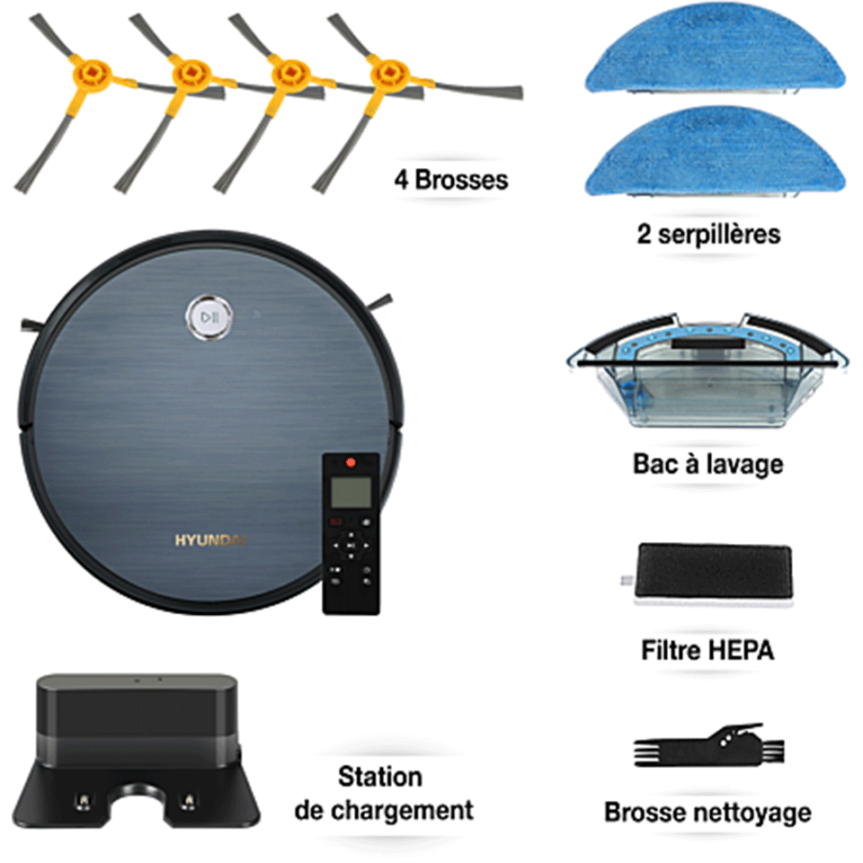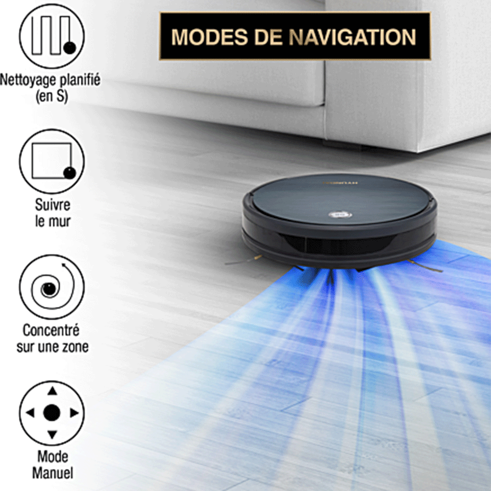 L’aspirateur robot HY-APRADG2R-001 Smart Clean + de Hyundai est doté de 3 modes de navigation avec un Gyroscope (en S planifié, le long des murs ou approfondi sur une zone).