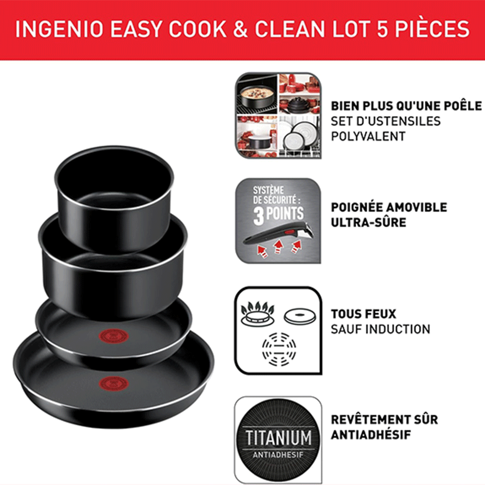 - Batterie de cuisine 5 pièces avec poignée amovible TEFAL