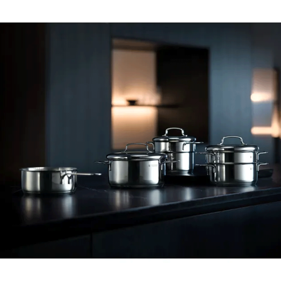 La batterie de cuisine 5 pièces (tous feux dont induction) WMF est conçue pour s’adapter à toutes les cuisines, même les plus petites, grâce à son design compact et empilable.