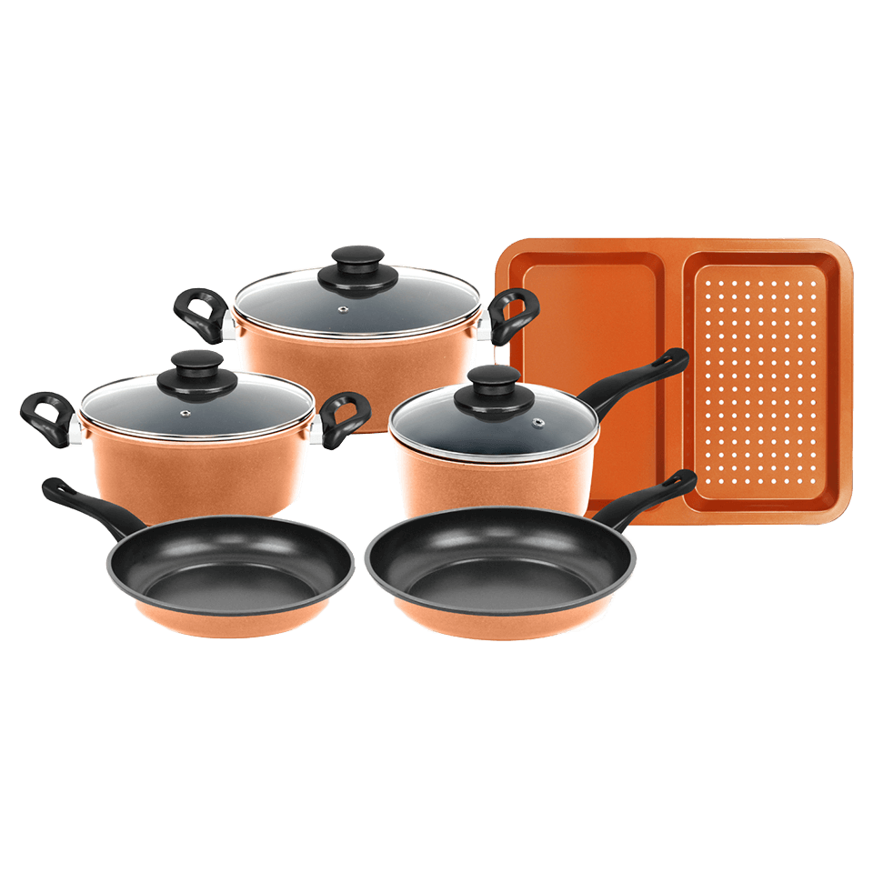 Ce coffret complet comprend tout le nécessaire pour cuisiner avec aisance : deux cocottes avec couvercle, deux casseroles dont une avec couvercle, deux poêles à frire, une plaque à four, et une autre cocotte polyvalente.