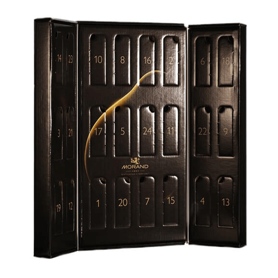 Magnifique Calendrier de l’avent en carton de haute qualité contenant 24 mignonettes 2cl des produits phare de la Distillerie Morand.