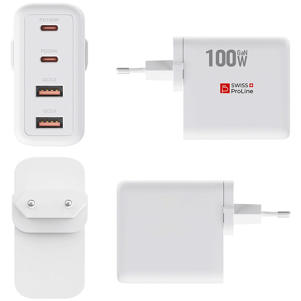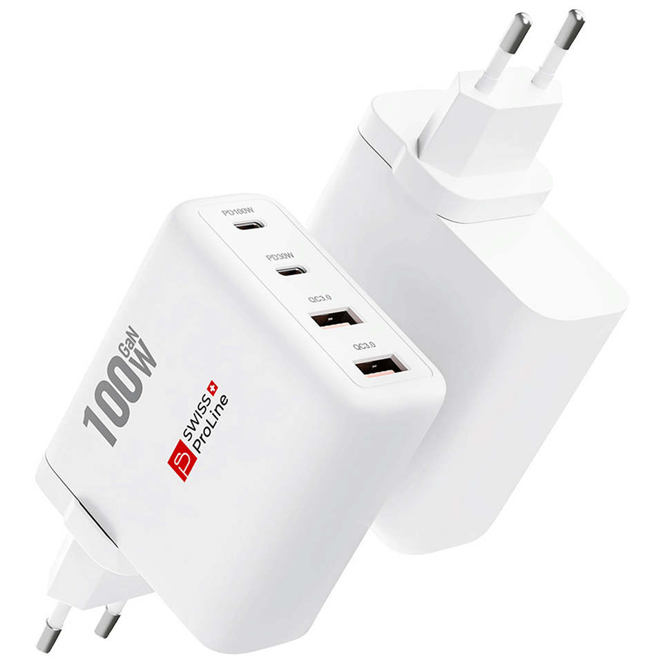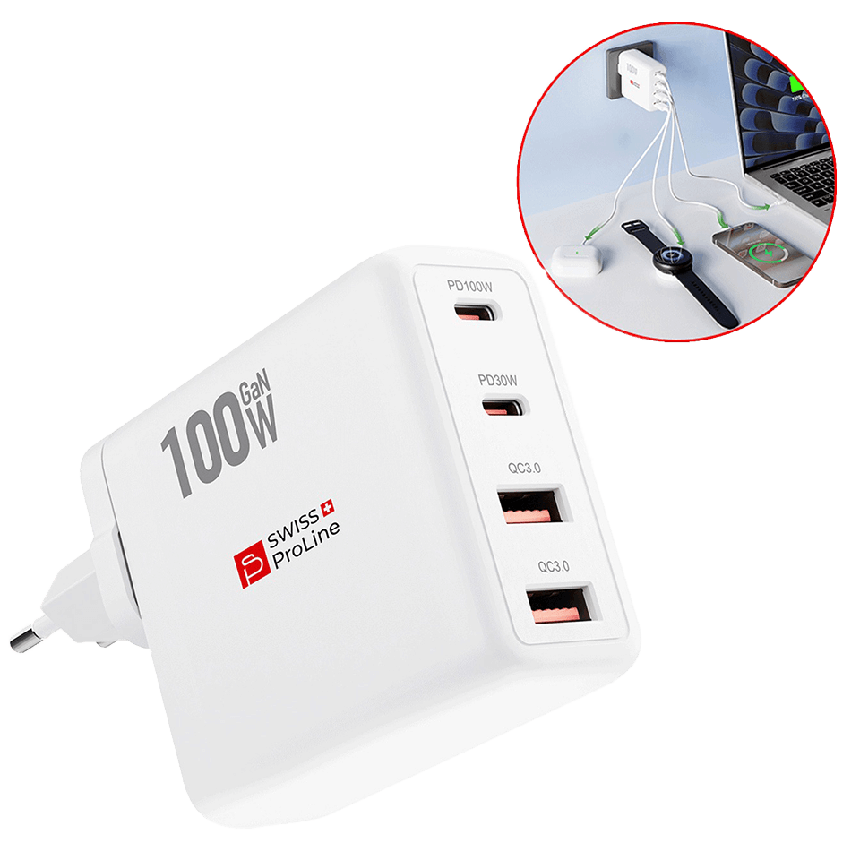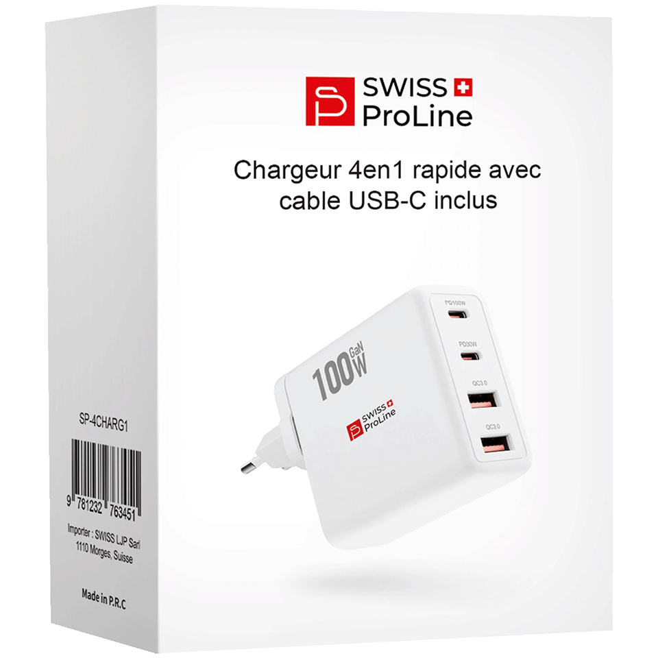 Chargeur rapide 4-en-1 100W avec câble USB-C inclus. Équipé de 2 ports USB-C et 2 ports USB-A, il permet de recharger simultanément jusqu’à quatre appareils avec une puissance totale de 100W. Compatible avec ordinateurs portables, tablettes, smartphones, consoles et accessoires, il assure une recharge ultra-rapide et stable. Sa technologie intelligente détecte automatiquement les besoins de chaque appareil et répartit l’énergie de manière optimale pour garantir une charge efficace et sécurisée. Conçu avec des protections intégrées contre la surchauffe, les surtensions et les courts-circuits, il offre une sécurité maximale au quotidien. Son design compact et moderne le rend facile à transporter, que ce soit à la maison, au bureau ou en voyage. Le câble USB-C fourni complète l’ensemble pour une utilisation immédiate et pratique.