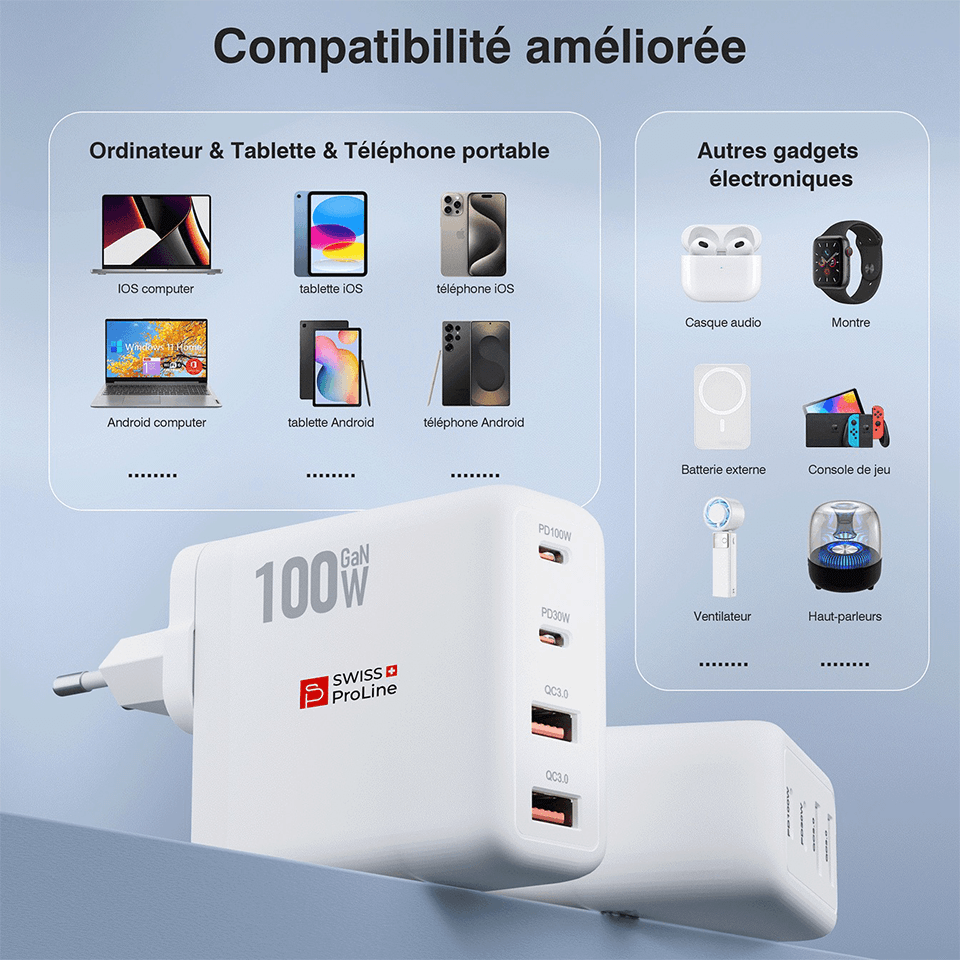 - Puissance totale 100W pour recharger ordinateurs portables, tablettes et smartphones en un temps record