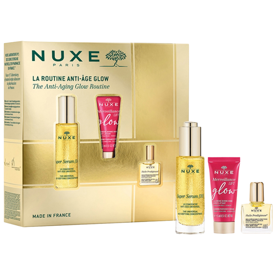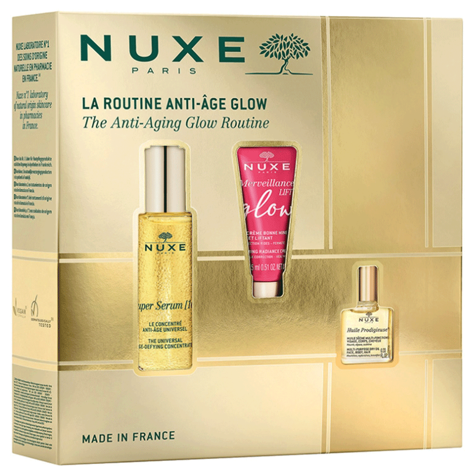 Nuxe Coffret Noël 2024 La Routine Anti-Âge Glow regroupe vos alliés anti-âge pour une peau lissée et éclatante associés à l’iconique Huile Prodigieuse :