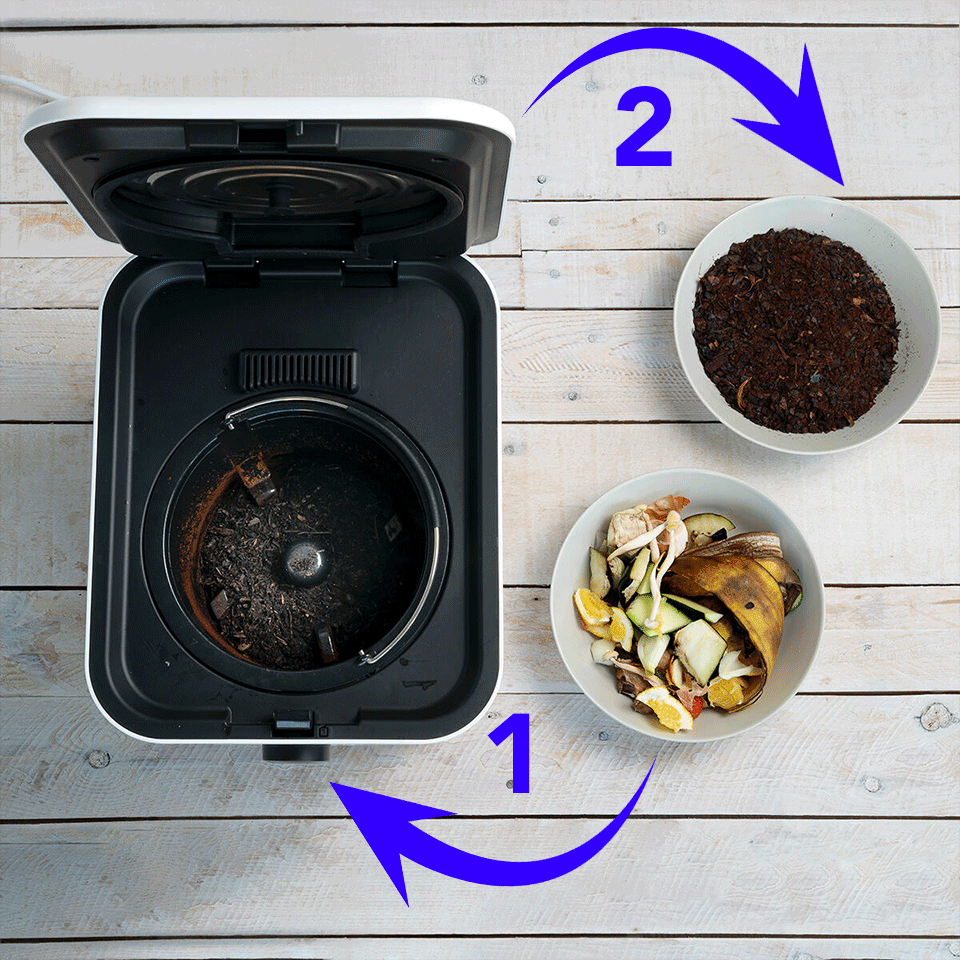 Le composteur réalise un cycle complet en trois étapes : séchage, broyage et refroidissement, le tout automatiquement pour un résultat rapide et sans effort.