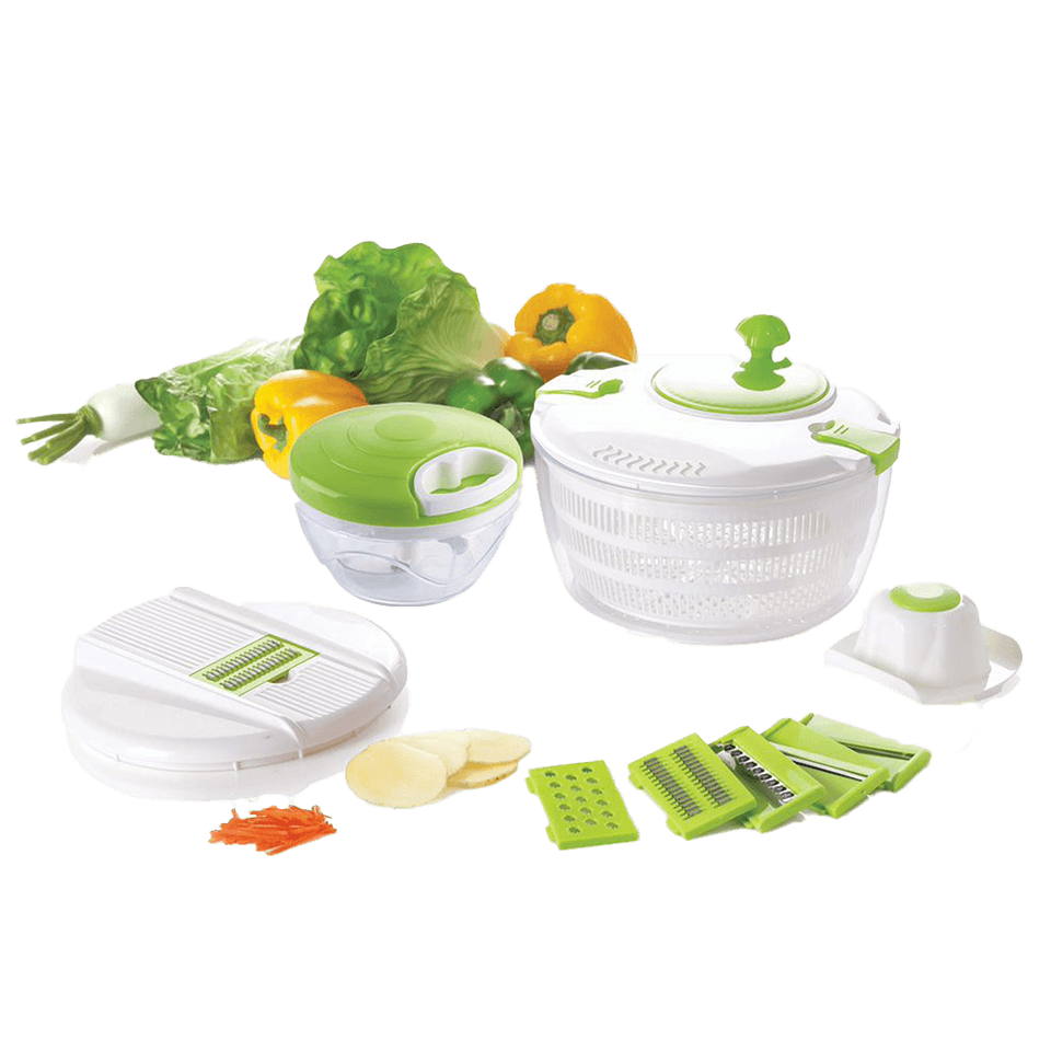 Le panier essoreur intégré permet de sécher efficacement les légumes, tandis que l’accessoire hachoir inclus transforme ce set en un véritable assistant culinaire polyvalent.