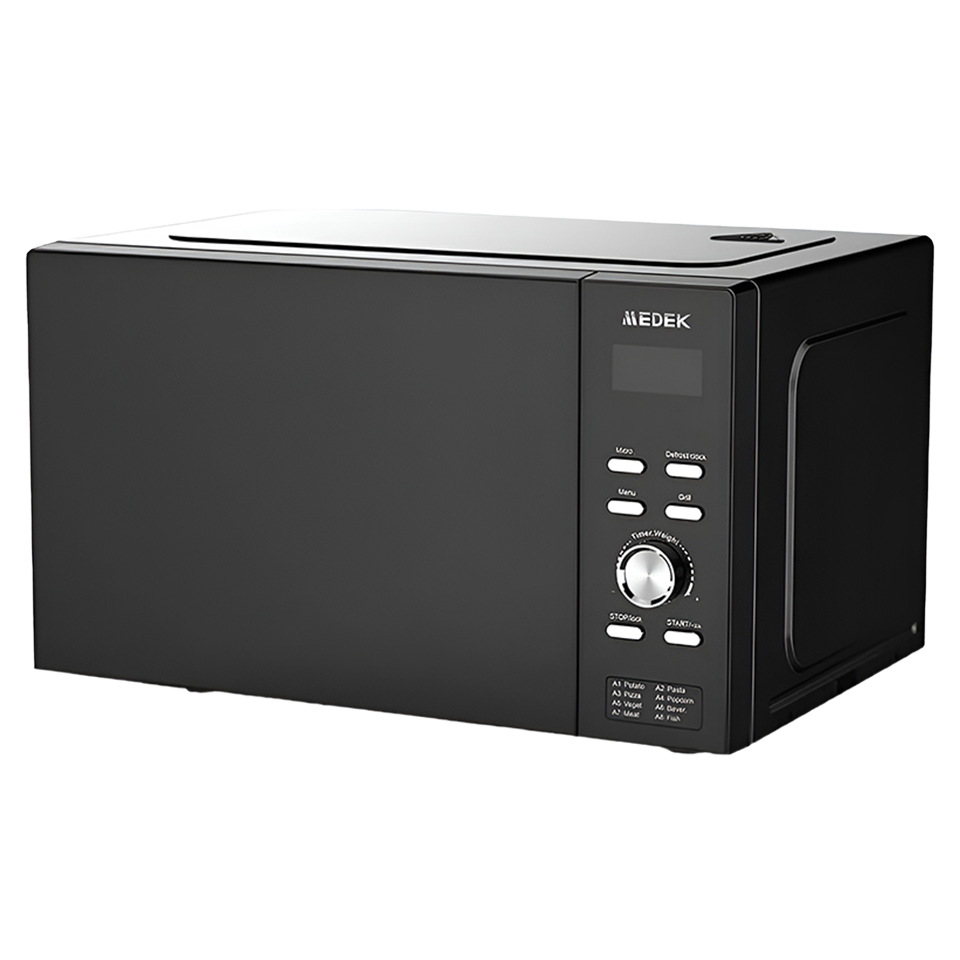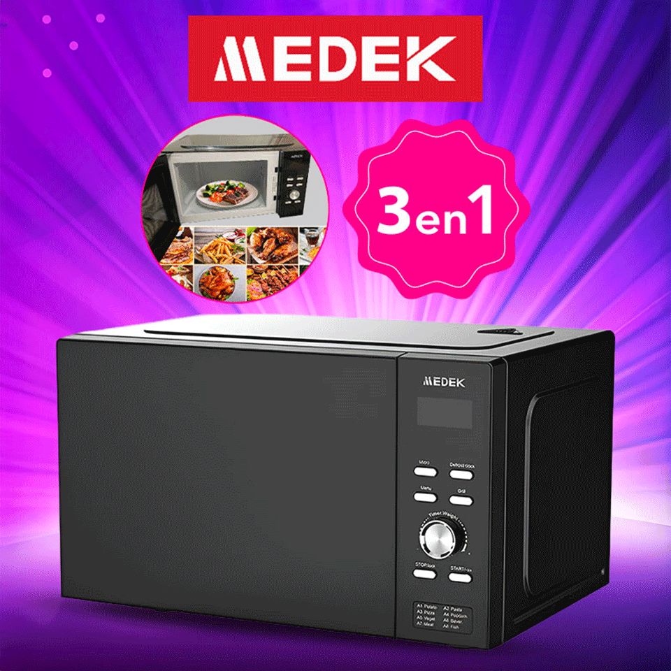 Découvrez le micro-ondes multifonctions MEDEK au design noir élégant, idéal pour une cuisine moderne et pratique.