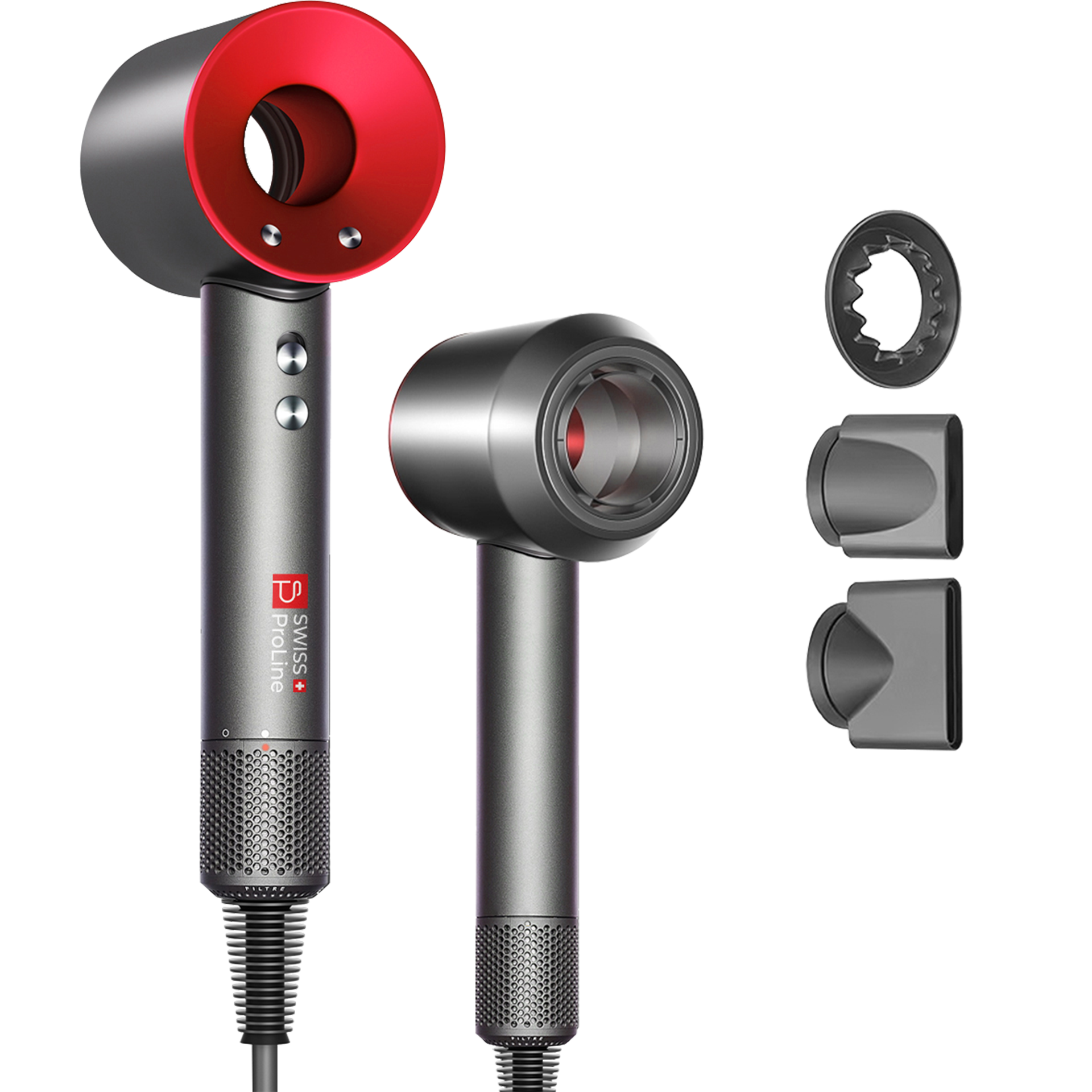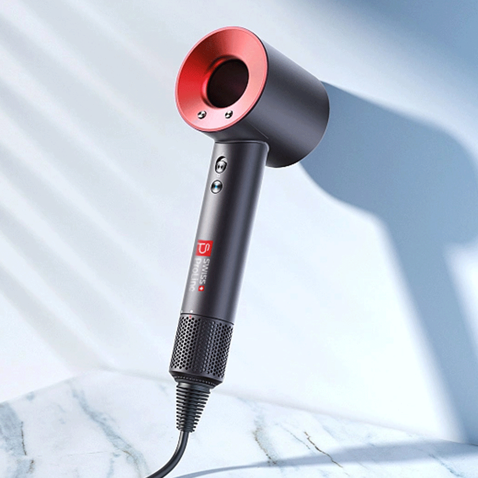 Le sèche-cheveux Swiss ProLine est équipé d’une attache magnétique qui facilite l’utilisation et le retrait des têtes interchangeables, leur permet de pivoter à 360° et prévient également la casse éventuelle des pièces mécaniques de l’attache.