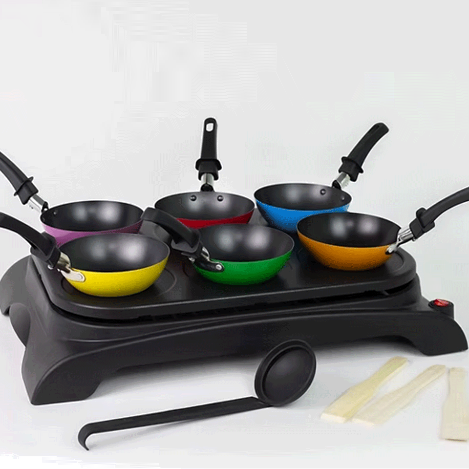 Équipée de 6 woks individuels, elle permet de préparer plusieurs crêpes simultanément avec une cuisson uniforme.