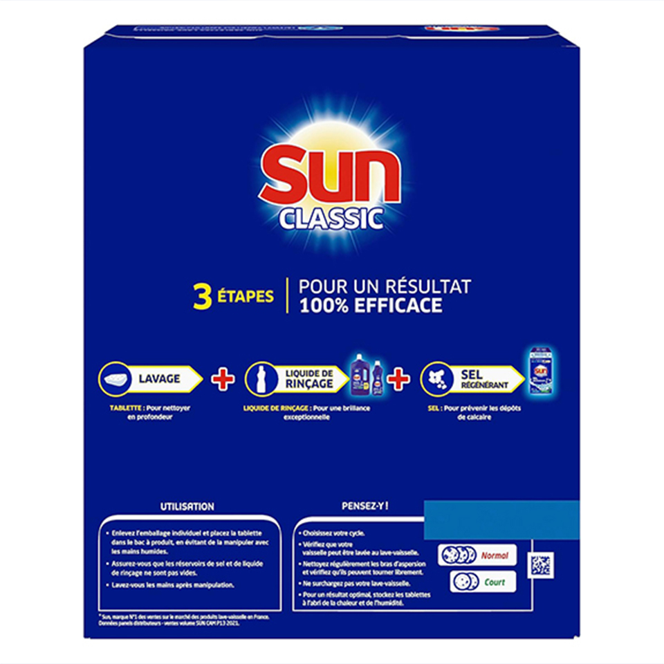 Pour un résultat impeccable sur votre vaisselle, utilisez la combinaison des trois produits : la pastille Sun Classic nettoie en profondeur, Sun Liquide de Rinçage garantit une brillance exceptionnelle et Sun Sel Régénérant prévient les dépôts de calcaire.